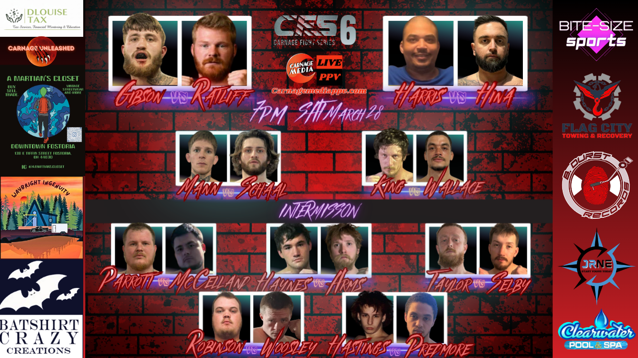 Join Clayton, Connor, Wade, Kev and Zac on Wednesdays at 7:30 PM EST on our YouTube channel, as they dive deep into the world of mixed martial arts. From the latest fight news and analysis from around the globe to exclusive breakdowns of every fight card featured on Carnage Media PPV broadcasts, they’ve got it covered. Tune in for insightful interviews with up-and-coming fighters, all while staying up-to-date with the action-packed world of MMA through the eyes of the Carnage Media team.