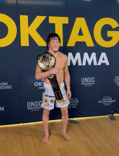 Oktagon MMA’s new Flyweight Champion, Zhalgas Zhumagulov, posing with his new belt post fight