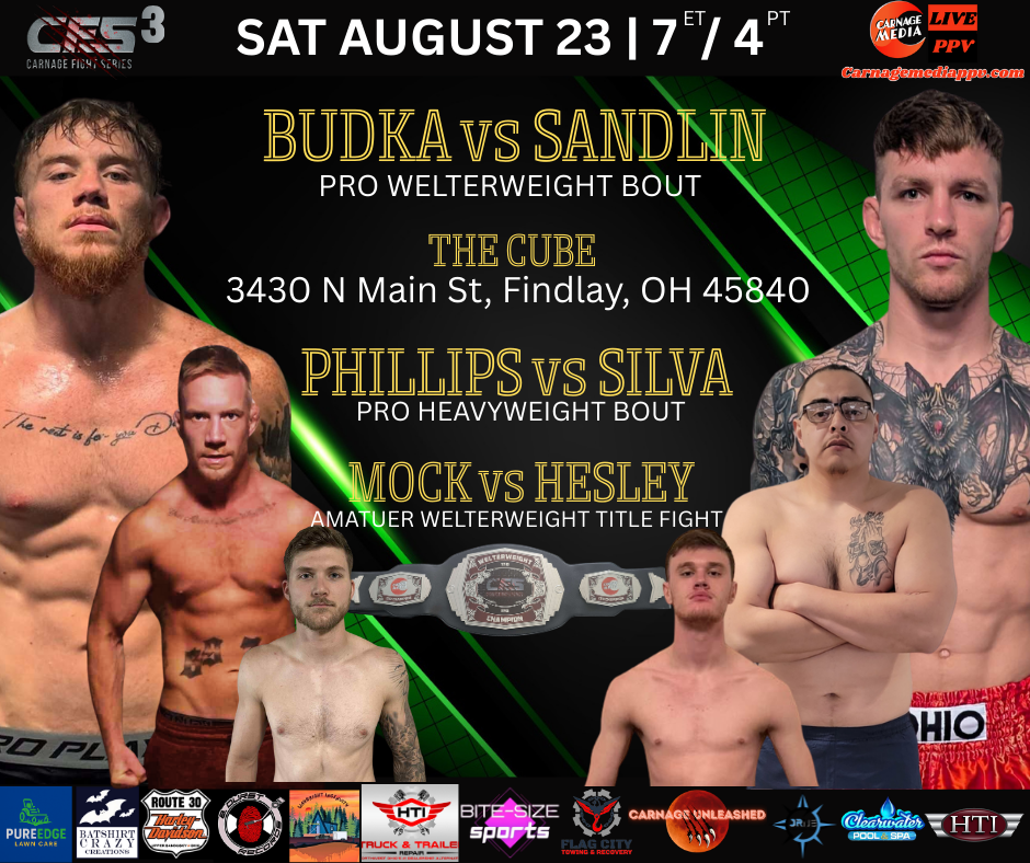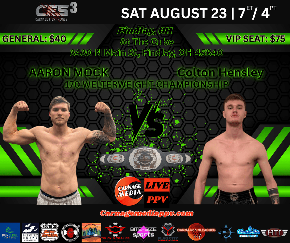 There are still tickets available at the door, and you can’t make the fights in person, you can purchase the pay-per-view right here at carnagemediappv.com!! See you at the fights!