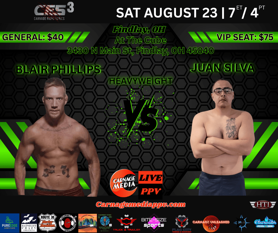 The co main event features heavy handed Juan “El Beaner” Silva (0-1) takes on Blair “Mr. No Gimmick” Phillips (1-1) in a heavyweight contest. Both of these fighters have ties to the Northwest Ohio area (Silva is from Fostoria, Phillips currently trains in Findlay), and promise to bring the action when the cage doors close.