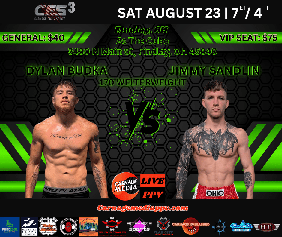 The former collegiate wrestler has been very open recently about his struggles with addiction and depression during his UFC tenure, and has worked towards getting back to the biggest promotion in the sport. On the other hand, the 30 year old Sandlin is coming off of a fight of the year contender against Quintin “The Guy” Richards at Carnage Fight Series 2 in Sandusky, OH. Although he came up short, Sandlin’s toughness and grit earned the respect of all in attendance (see the fight here) and set him up for a match with Budka, one of Ohio’s top fighters not currently in the UFC. Sandlin, who’s hovered around 170 pounds for most of his career, took a jab at Budka’s weight miss at UFC Fight Night: Burns vs Brady in September 2024, saying