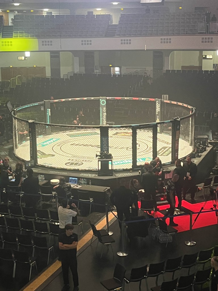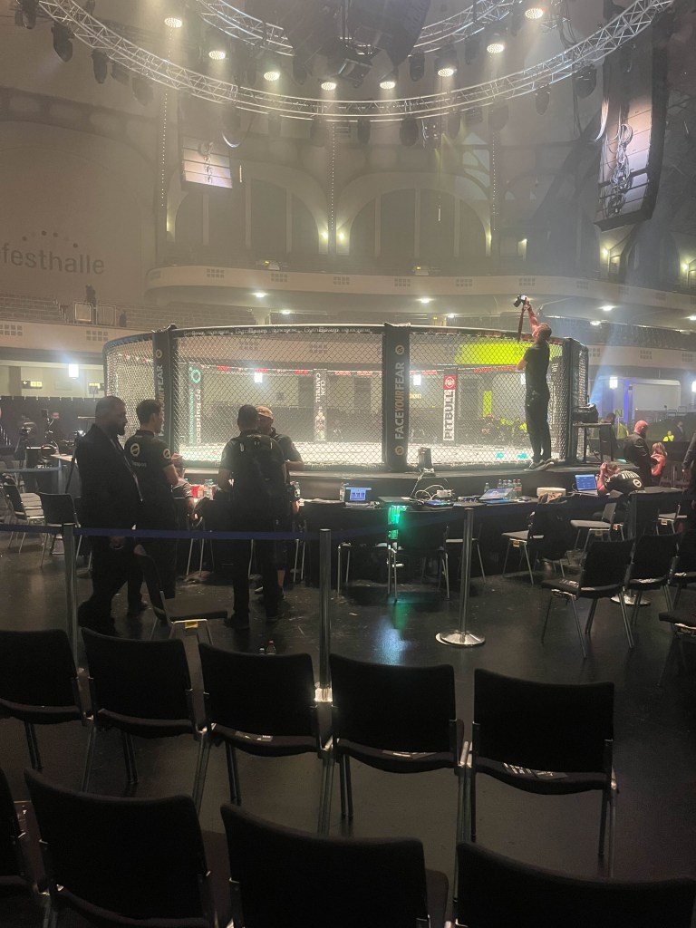 I made my way to the press entrance, and chatted with a couple other journalists I met at the previous show I worked at as we made our way to the third floor to get set up in the press room. I took some time before the start of the event to check out the arena, and was very impressed with the setup Oktagon had, from the cage itself to the professionalism displayed by arena staff pre-event. Christian Eckerlin was part of the pre-event show, with the desk being just feet away from where I was sitting, which was extremely cool. After making my way back to the press area, the first bell rang and Oktagon 76 got underway.