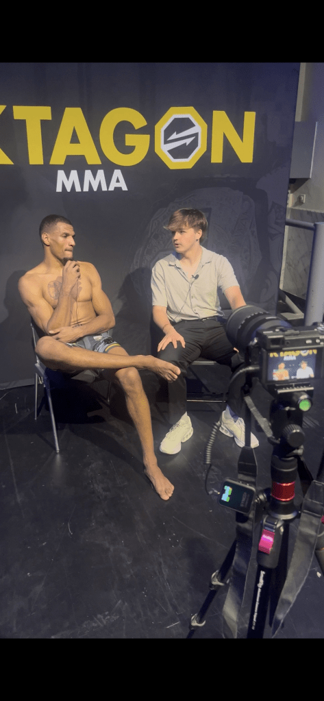 After three straight unanimous decisions, 2 straight fights ended via rear naked choke. Despite this, I felt like the crowd was losing energy. No fights had any spectacular moments, and the people of Frankfurt were waiting for their big moment. Then the main card started off with one of the best knockouts of the year when German kickboxing prospect Alina Dalaslan (3-0) knocked out Clara Ricignuolo (3-4) with a spinning back elbow in the second round, causing the arena to erupt in support of their countrywoman. This knockout was one of the craziest I’ve ever seen in person (watch it here) and I truly believe that come December, it will be on the list for Oktagon’s knockout of the year. This fight was followed by Czech product Peter Gabel (7-4) taking on loudmouthed Denis “The Menace” Frimpong (7-2), who was born in Cameroon but now fights out of Dublin, Ireland. There was a lot of animosity surrounding this fight, with both fighters scoring multiple verbal jabs leading into this fight. Frimpong had my favorite walkout of the night, hitting ping pong balls into the crowd to play on a comment made by Gabel. Going into the third round, the fight was even (Oktagon has open scoring- interesting touch), but Frimpong put on a striking clinic to put away Gabel via strikes. I caught up with Frimpong after the fight, and he had a difficult time walking afterwards due to the damage he sustained. He called out all the top lightweights, and mentioned wanting the winner of Richie Smullen vs Ivan Buchinger, which takes place October 4th.
