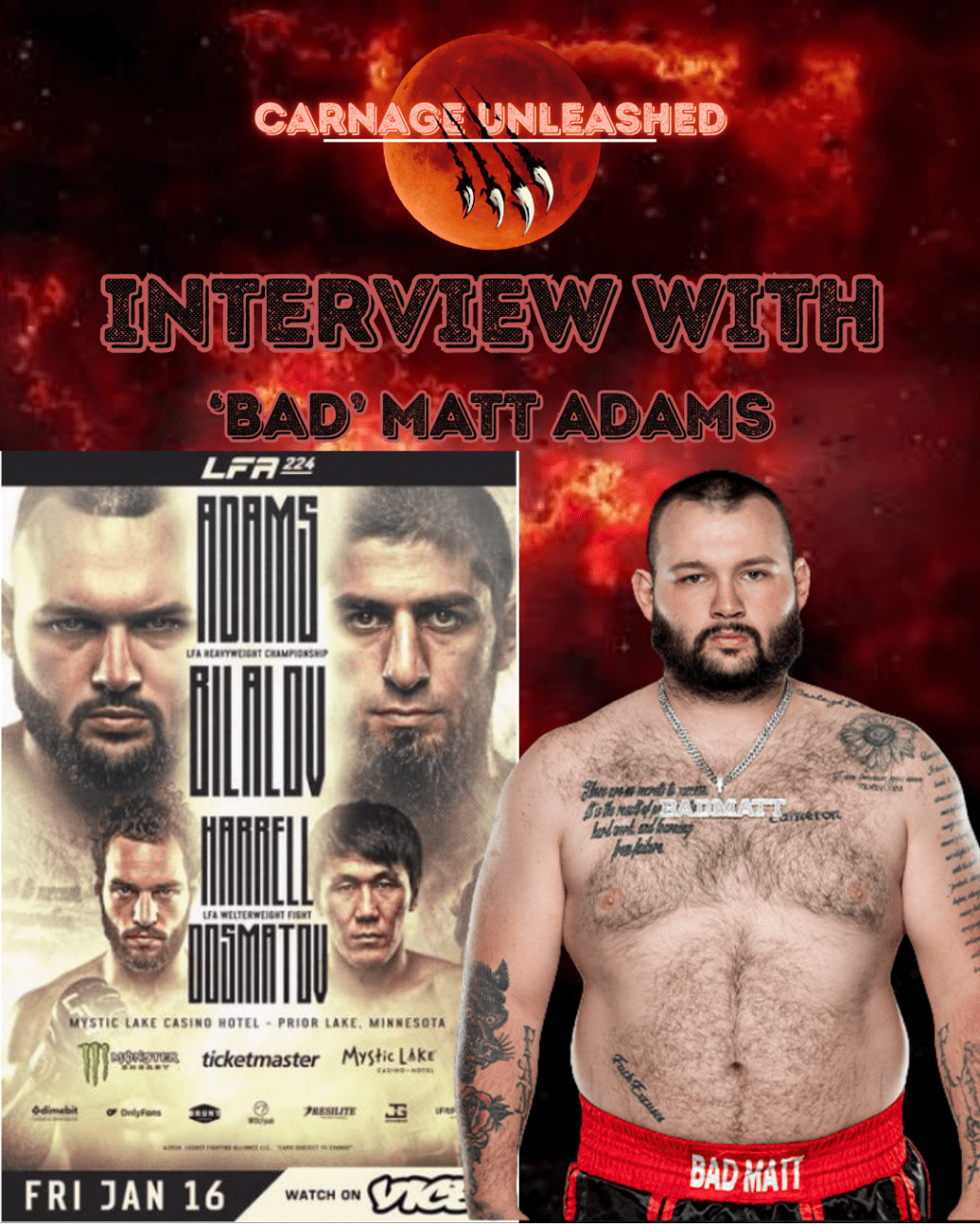 Connor Smith and Clayton Skulina sat down with “Bad” Matt Adams, the challenger for the LFA Heavyweight Championship, for an exclusive interview on Carnage Unleashed.