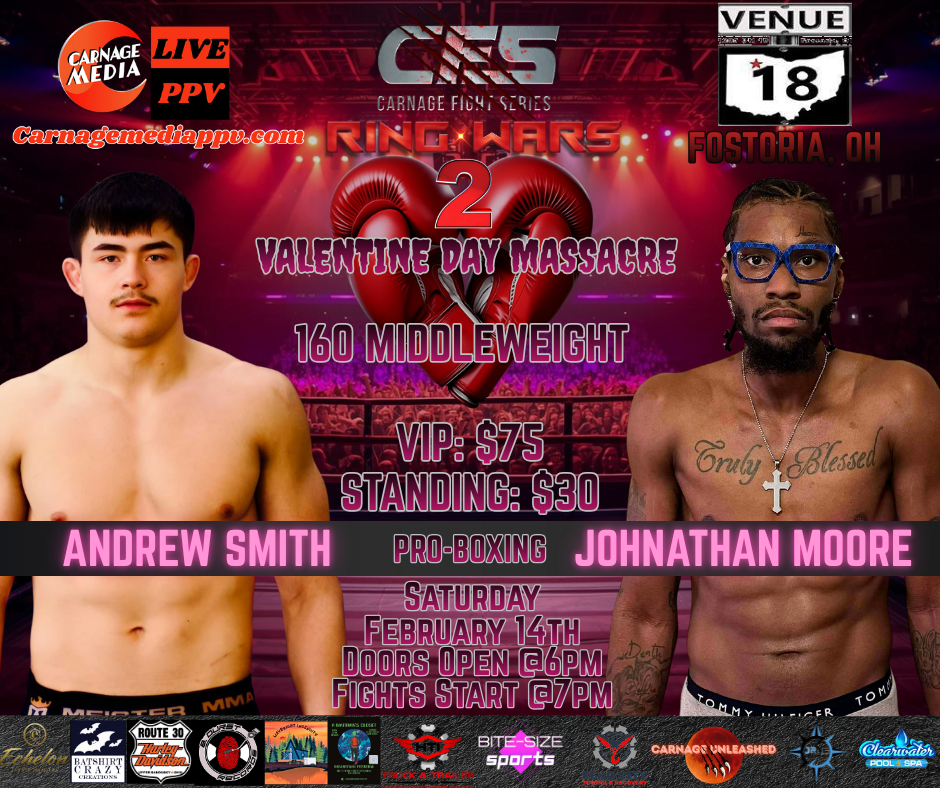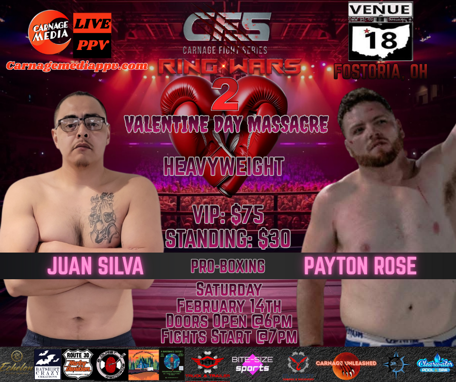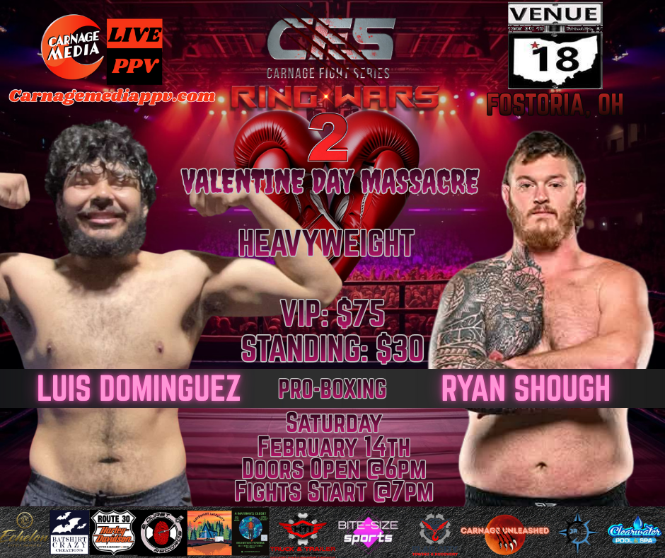 CFS Ring Wars 2: Valentine’s Day Massacre will be live from Venue 18 on Saturday, February 14th! Catch all of the action live in Fostoria or join us at Carnage Media for the pay-per-view. Tickets will be available soon, so check back to get yours early!