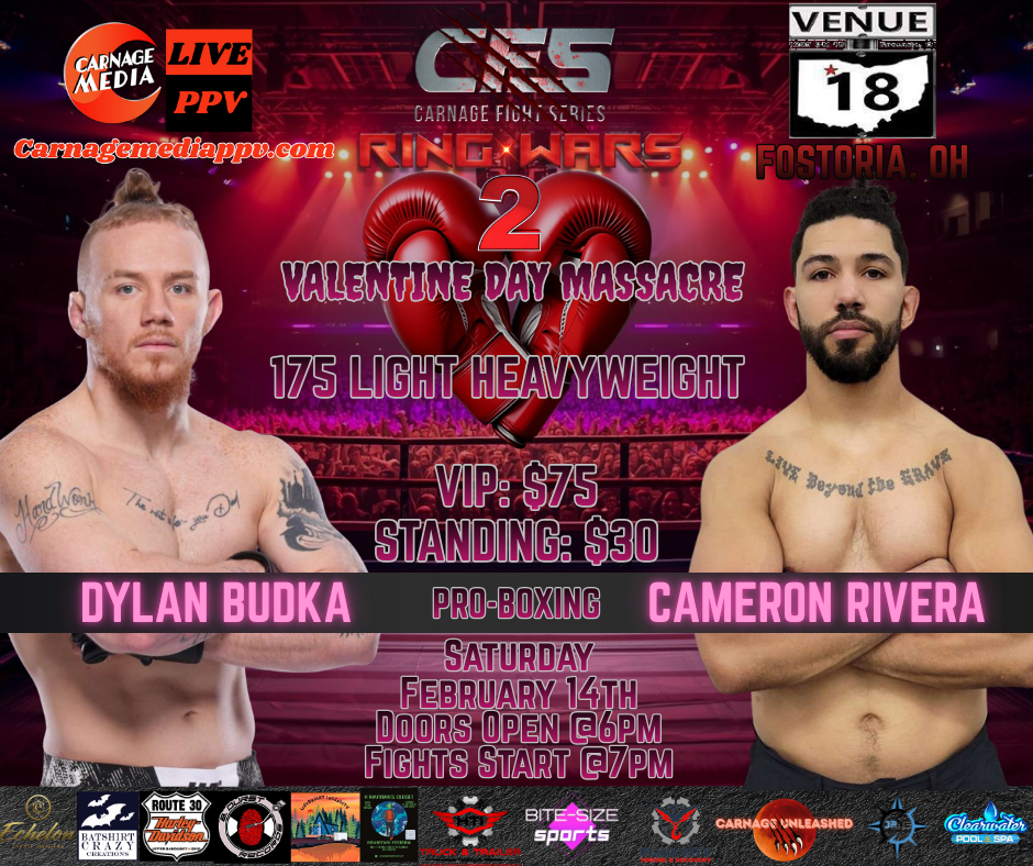 Carnage Fight Series returns to Venue 18 for an intense night of boxing and kickboxing action! On Saturday, February 14th, CFS presents Ring Wars 2: Valentine’s Day Massacre. With an undercard of amateur kickboxing, followed by a main card of pro boxing bouts, Ring Wars is a striking fans’ dream. While the full card has yet to be announced, some must-see matchups have already been greenlit.